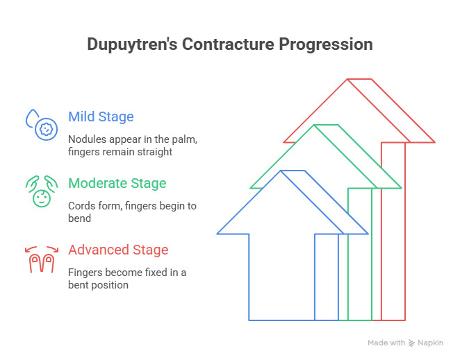 Dupuytren’s contracture typically progresses through stages, with symptoms becoming more noticeable over time.